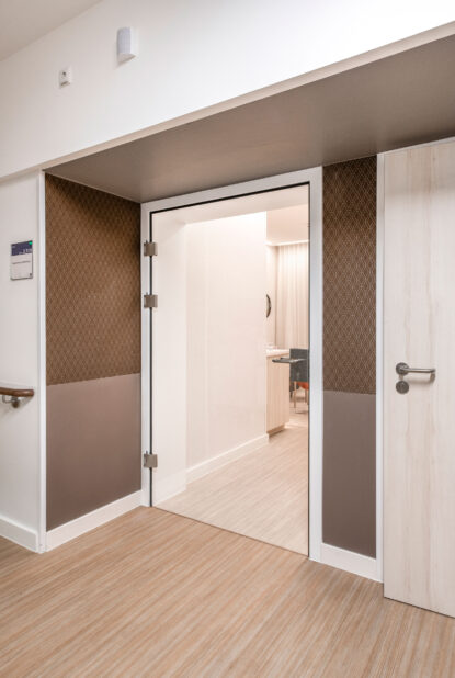 Der hohe Anspruch der Medizin, geht hier Hand in Hand mit zeitgemäßer modern-eleganter Innenarchitektur. Anspruchsvolle PrivatpatientInnen genesen hier im Komfort zurückhaltend zeitlos sensuellen Designs. Ein Hauch Ethnolook in der Lounge ergänzt das sorgfältig abgestimmte gewisse Etwas im Patientenzimmer, mit seiner Komposition von Graunuancen, feinen Metallics, Holz und Stein. Am spezifischen Krankheitsbild in der HNO orientiert, fördern zudem Innovationen, wie akustisch wirksam transparentes Textil das positive Erlebnis während der Verweildauer.